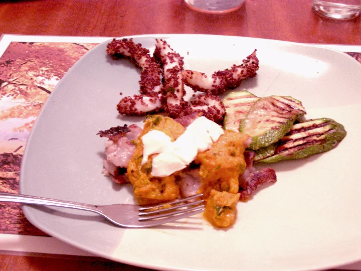 Home-made, fresh peach gelato served with peaches prepared in brown sugar, topped with a crumble made from toasted almond cookies.