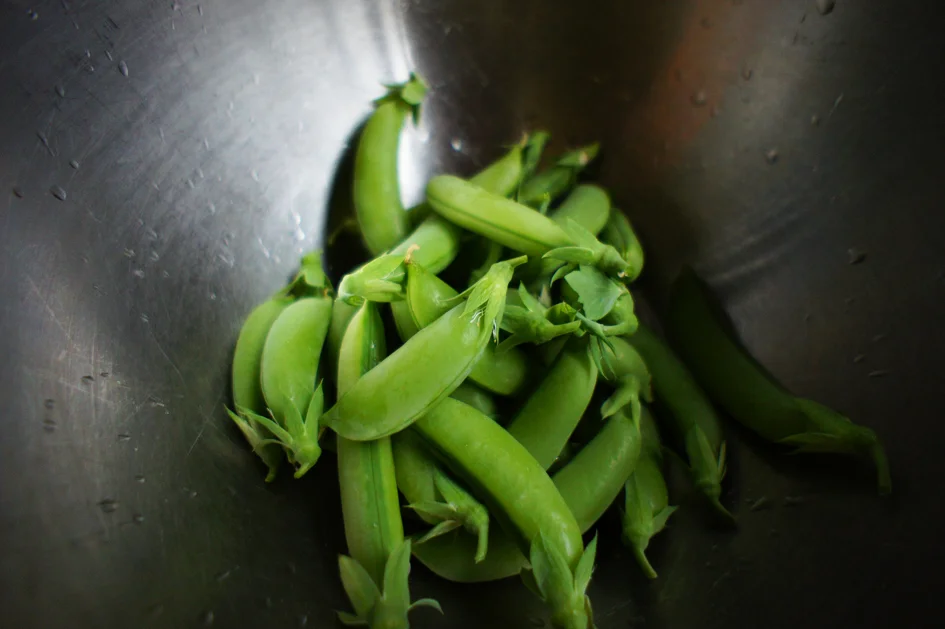 Dark, dark red leafed lettuces (S.G.), dressed simply in olive oil/dash of white wine vinegar/cracked pepper/lemon salt. Topped with delicately opened english shelling peas (S.G), the casing of which were filled in with deep, rich (fancy, expensive) balsamic vinegar, matching the lettuce and complimenting the crisp sweetness of the peas. Shavings of a spanish semi-hard goat's cheese recommended by the cheesemonger at City Market. I'd tell you what it's called, but saving cheese wrappers is never something I actually remember to do. And if I did, I'd be one of those people who saved cheese wrappers, and so on.